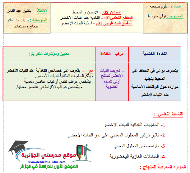 مرحبا بكم متابعي و زوار، موقع مدرستي الجزائرية, ارتأينا في هذا الموضوع بحول الله تقديم لكم، تحضير درس أغذية النبات الاخضر في مادة العلوم الطبيعية للسنة الاولى متوسط ، بأسلوب جديد في الفصل الدراسي بين الأساتذة والتلاميذ.